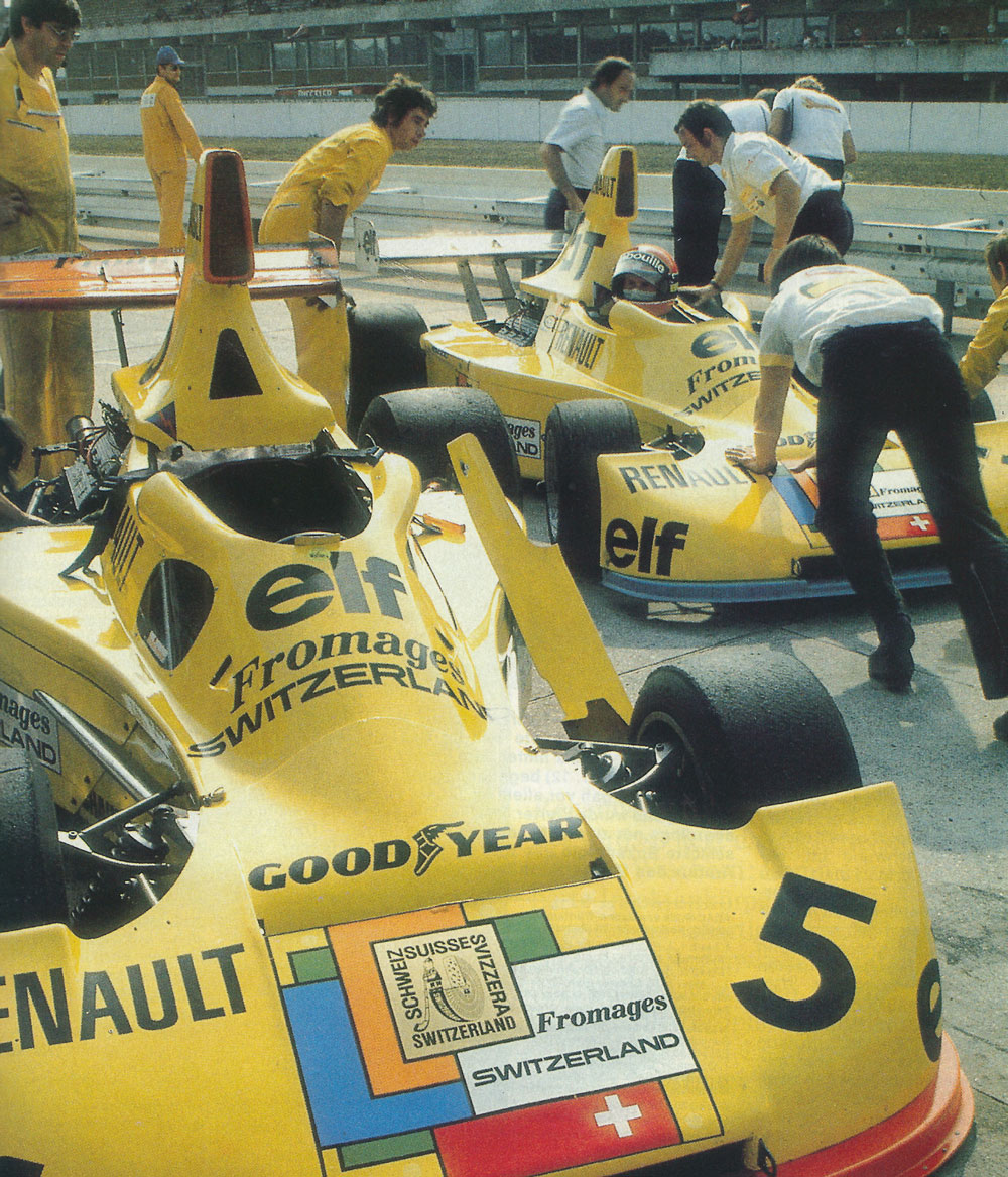 Der in Bezug auf die Technik seines Rennwagens äußerst versierte Jean-Pierre Jabouille fuhr 1979 – nach einem weiteren Motorendefekt in Buenos Aires – in Interla-gos nur auf Ankommen, während Schwa-ger Laffi te einen weiteren Start-Ziel-Sieg im Ligier JS11 feiern konnte. In Kyalami stellte er den R.S. 02 auf die Pole-Position, leider brach in der 48. Runde eine Ventilfeder. Beim Training in Long Beach scherte eine Halbwelle ab: Jabouilles Renault spielte anschließend mit 270 km/h Pingpong mit den Begrenzungsmauern. Jean-Pierre kam mit blauen Flecken davon. Da aber auch bei seinem neuen Teamgefährten René Arnoux die Halbwellen versagten, verzich-tete Renault aus Sicherheitsgründen auf einen Start. Nach drei Null-Nummern folg-te der Grand Prix von Frankreich in Dijon – der Durchbruch! Ein Paukenschlag be-reits in der Qualifi kation, denn Jean-Pierre Jabouille und René Arnoux verwiesen die Herren Villeneuve, Piquet, Scheckter und Lauda klar auf die Plätze. Während sich Gilles Villeneuve und René Arnoux – Ab-stand meist innerhalb einer Sekunde – ein heftiges Duell um den zweiten Platz lie-ferten, zog Jean-Pierre locker davon. Freudentränen in der Équipe Renault: erster Turbo-Sieg in der Formel 1! Während Jean-Pierre in Silverstone wieder einmal von einer gebrochen Ventilfeder „geprügelt“ wurde, rettete sich René Arnoux mit nachlassenden Bremsen als Zweiter hinter Clay Regazzoni über die Ziellinie. Jabouilles Pole-Position in Hockenheim „erstickte“ nach einem Dreher im badischen Sand neben der Pis-te. Einziges erquickendes Erlebnis jenes Wochenendes: Die Formel-1-Party im „Dorian Gray“ des Frankfurter Flughafens. Kupplungsschäden in Zeltweg und Zandvoort, in Monza einmal mehr eine gebroche Ventilfeder, Jean-Pierre: „Es ist zum Verzweifeln.“ Bremsdefekt in Montreal, Wasser in der Elektrik beim Regen-rennen von Watkins Glen: Jean-Pierre blieb auf seinen neun Punkten von Dijon sitzen.